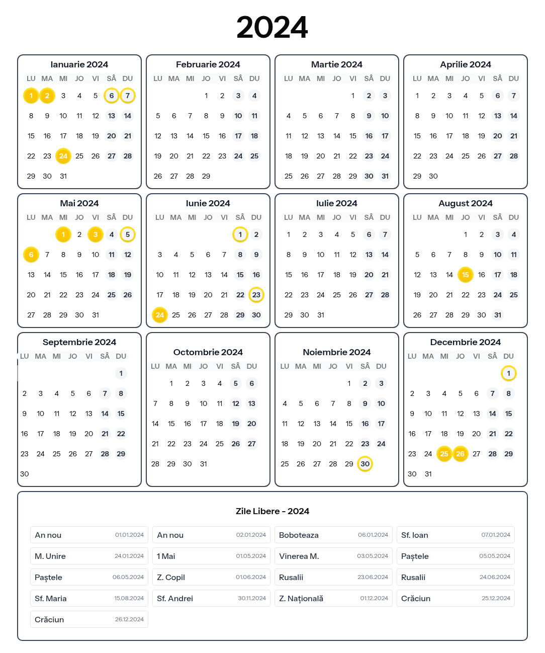 Bine ai venit pe pagina cu calendarul zilelor libere din România pentru anul 2024! Aici găsești toate sărbătorile legale, zilele nelucrătoare și informații despre punțile care te ajută să îți planifici concediile eficient. Calendarul nostru este actualizat constant și include toate zilele libere oficiale stabilite prin lege, precum și sugestii de punți pentru a maximiza timpul liber.