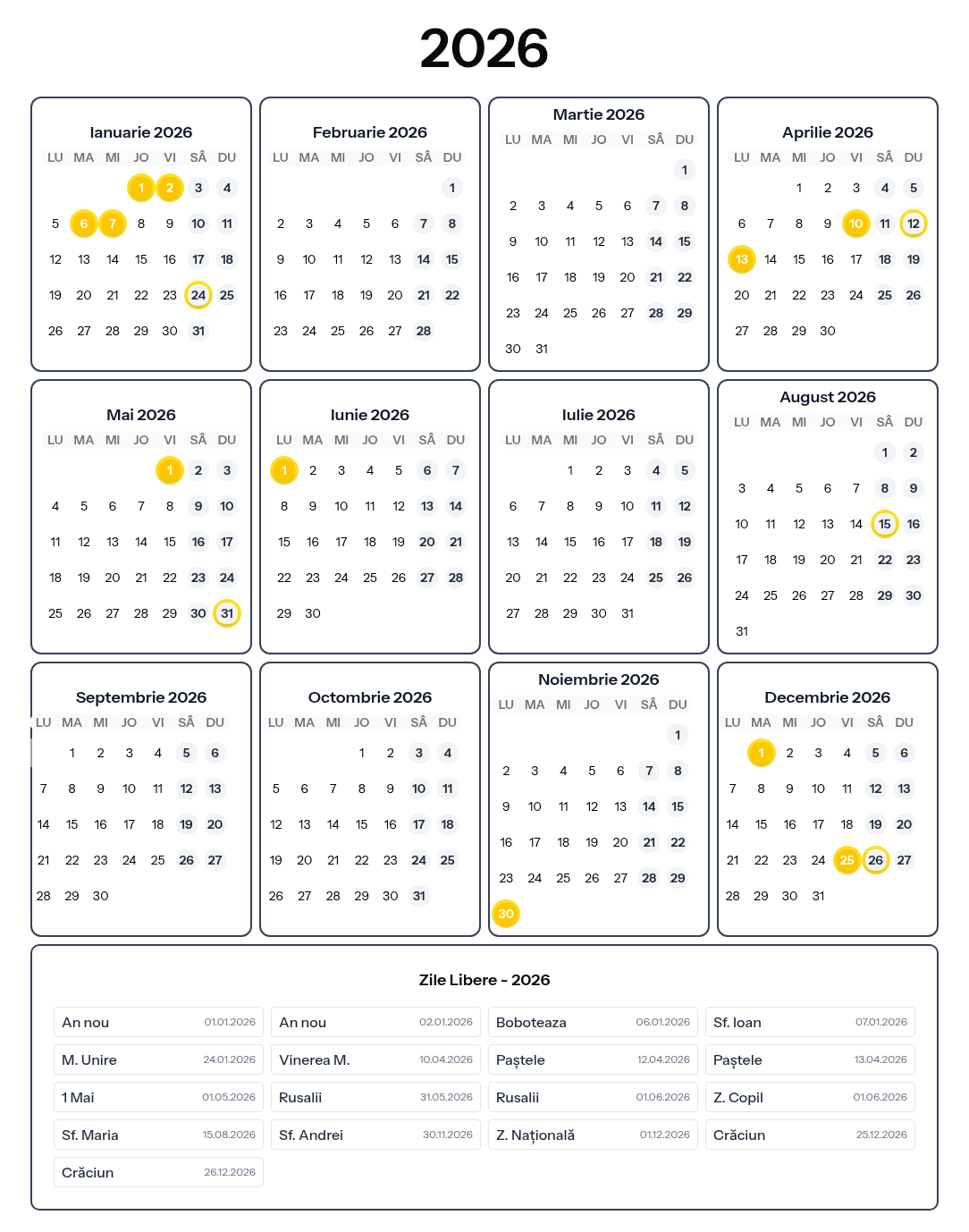 Verifică și calendarul pentru 2027 dacă vrei să planifici pe termen lung, sau vezi cum au fost zilele libere în 2025.