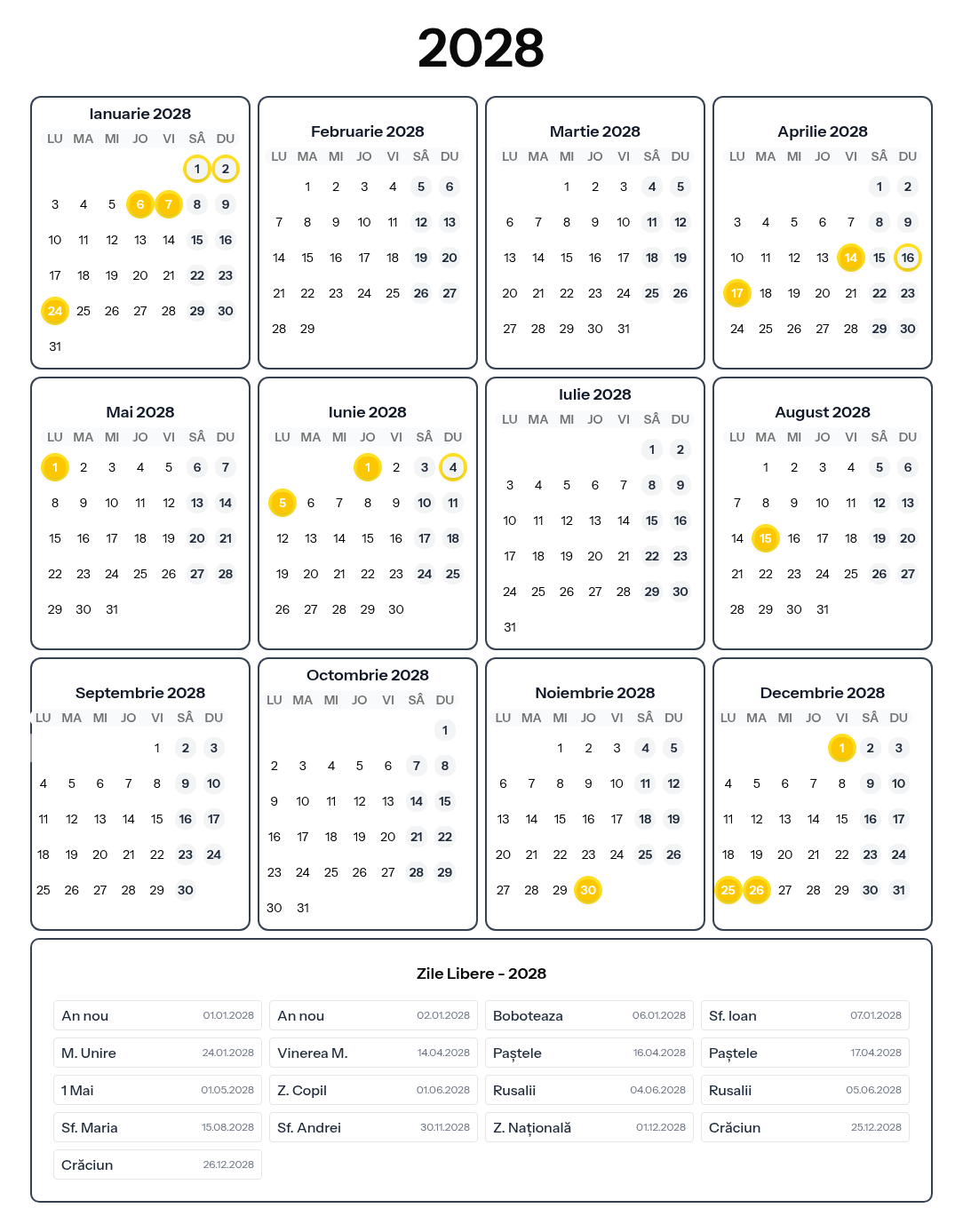 Bine ai venit pe pagina cu calendarul zilelor libere din România pentru anul 2028! Aici găsești toate sărbătorile legale, zilele nelucrătoare și informații despre punțile care te ajută să îți planifici concediile eficient. Calendarul nostru este actualizat constant și include toate zilele libere oficiale stabilite prin lege, precum și sugestii de punți pentru a maximiza timpul liber.