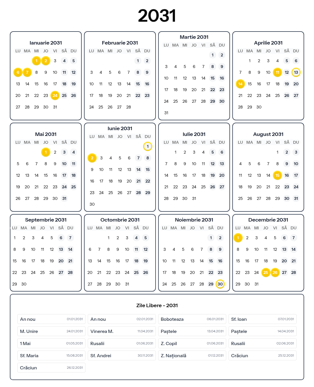 Bine ai venit pe pagina cu calendarul zilelor libere din România pentru anul 2031! Aici găsești toate sărbătorile legale, zilele nelucrătoare și informații despre punțile care te ajută să îți planifici concediile eficient. Calendarul nostru este actualizat constant și include toate zilele libere oficiale stabilite prin lege, precum și sugestii de punți pentru a maximiza timpul liber.