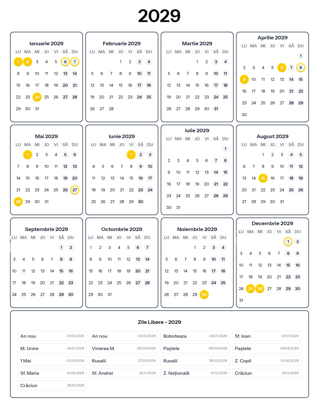 Calendar complet 2029 cu toate zilele libere legale, sărbătorile și ponturi pentru concedii din România.