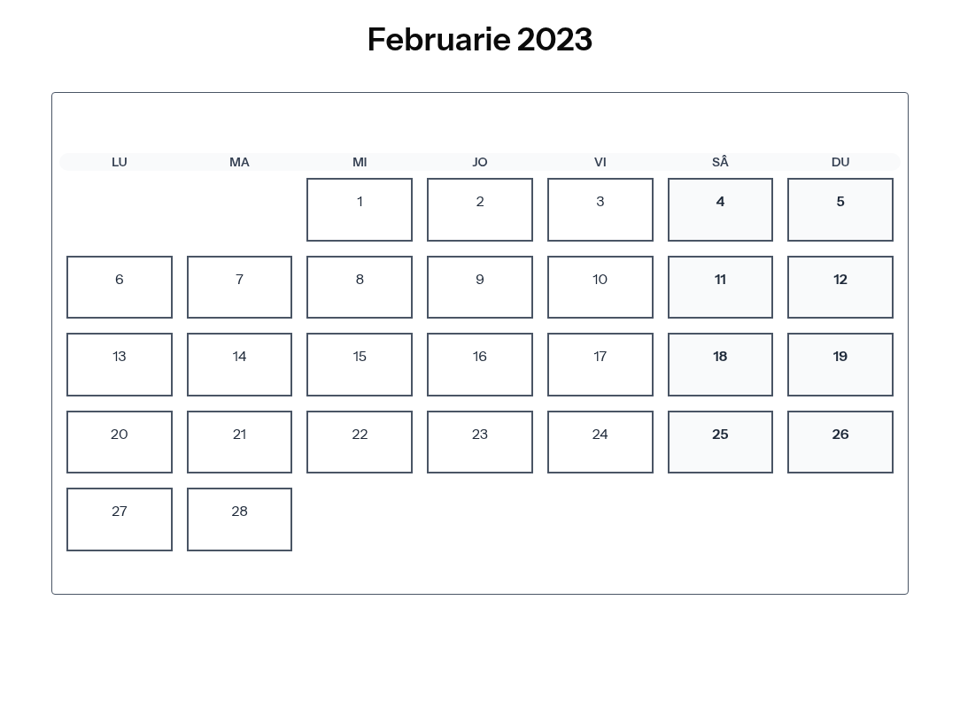Calendar complet pentru Februarie 2023 cu toate zilele libere legale și sărbătorile din România.