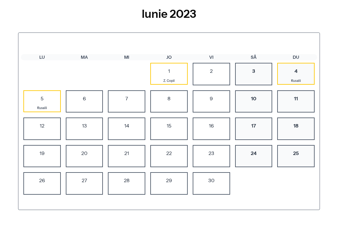 Calendar complet pentru Iunie 2023 cu toate zilele libere legale și sărbătorile din România.