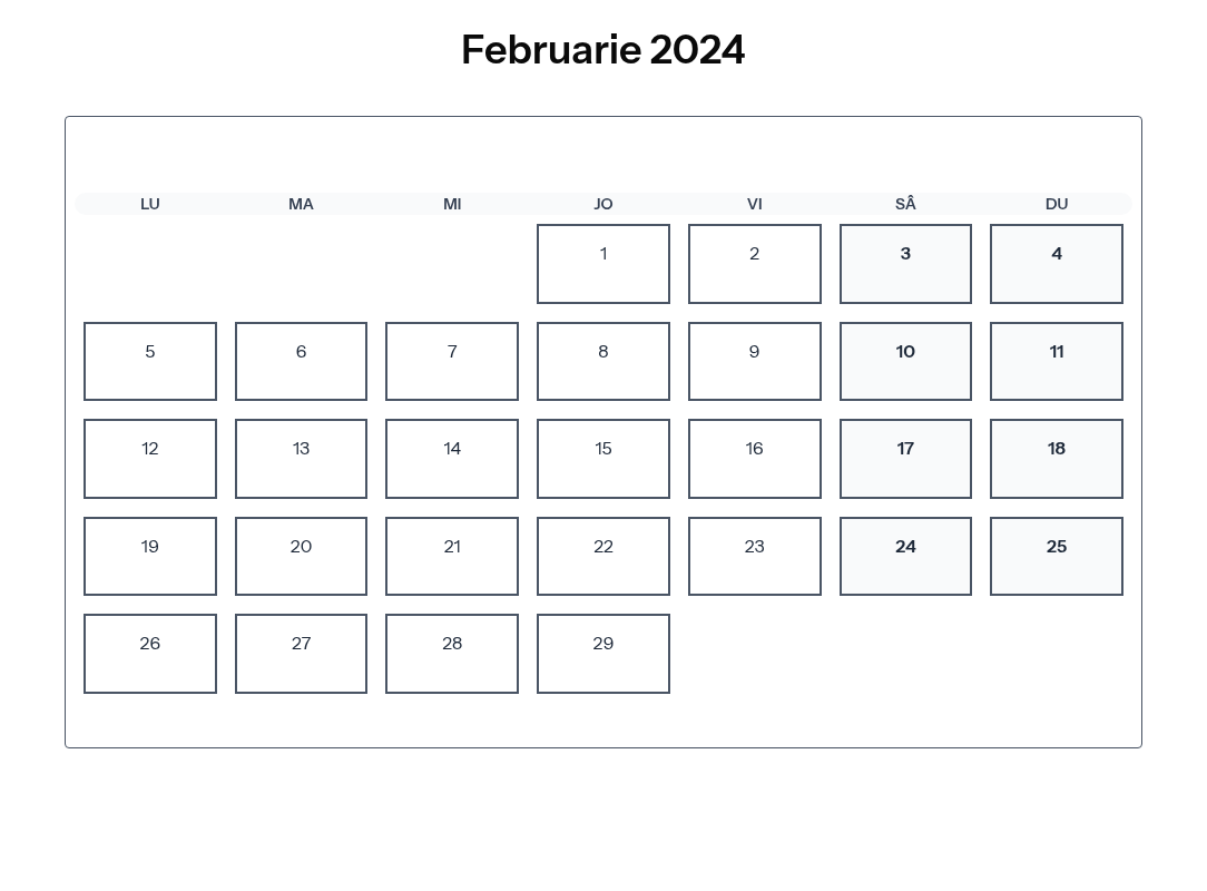 Calendar complet pentru Februarie 2024 cu toate zilele libere legale și sărbătorile din România.