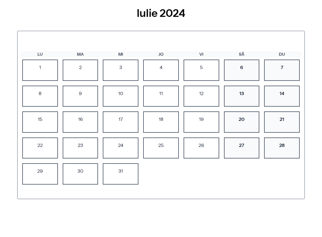 Calendar complet pentru Iulie 2024 cu toate zilele libere legale și sărbătorile din România.