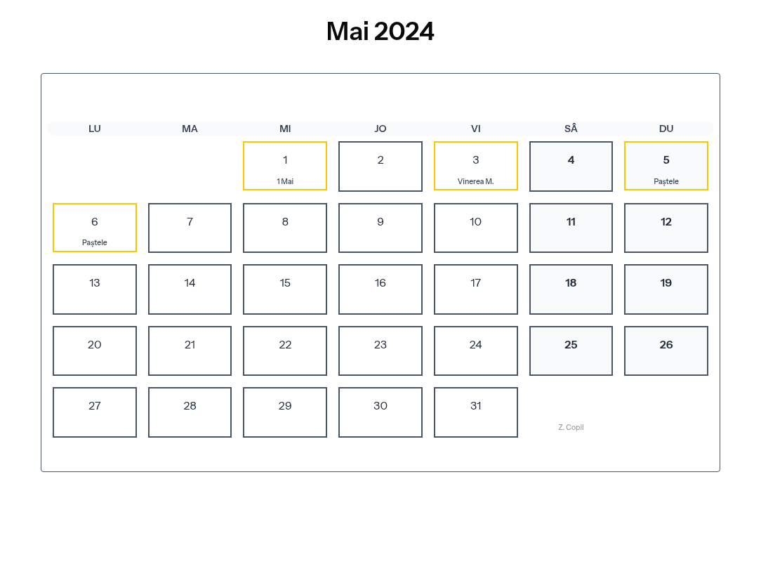 Calendar complet pentru Mai 2024 cu toate zilele libere legale și sărbătorile din România.