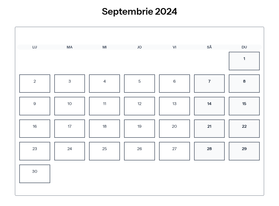 Calendar complet pentru Septembrie 2024 cu toate zilele libere legale și sărbătorile din România.