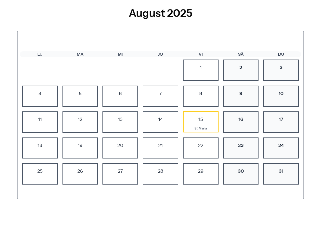 Calendar complet pentru August 2025 cu toate zilele libere legale și sărbătorile din România.