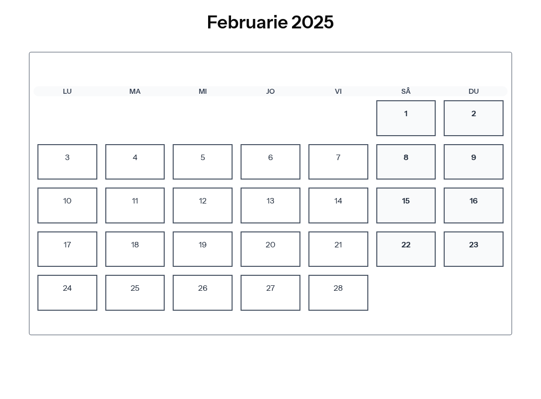 Calendar complet pentru Februarie 2025 cu toate zilele libere legale și sărbătorile din România.