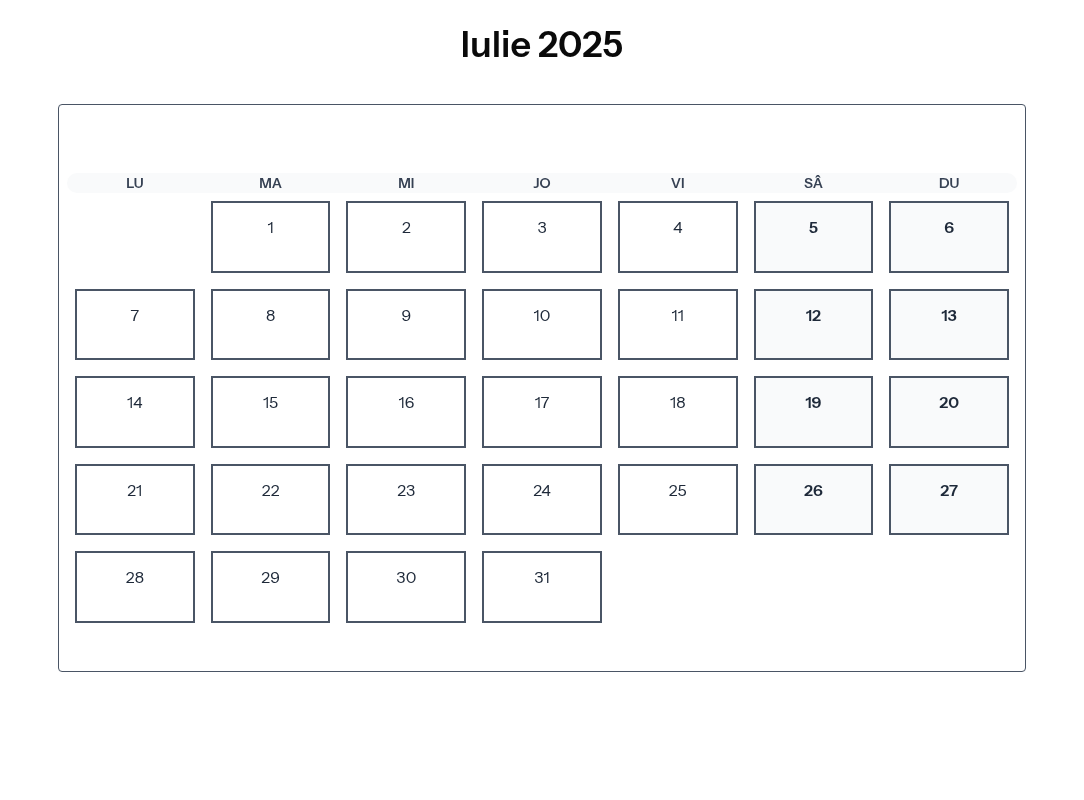 Calendar complet pentru Iulie 2025 cu toate zilele libere legale și sărbătorile din România.