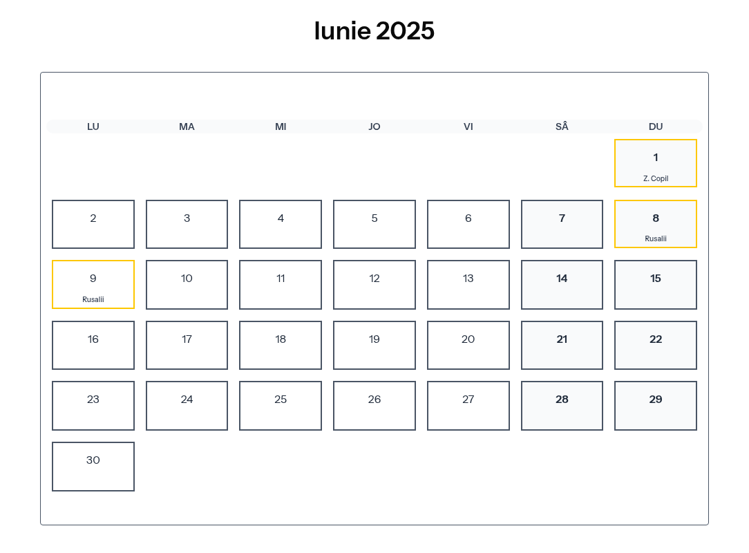 Calendar complet pentru Iunie 2025 cu toate zilele libere legale și sărbătorile din România.