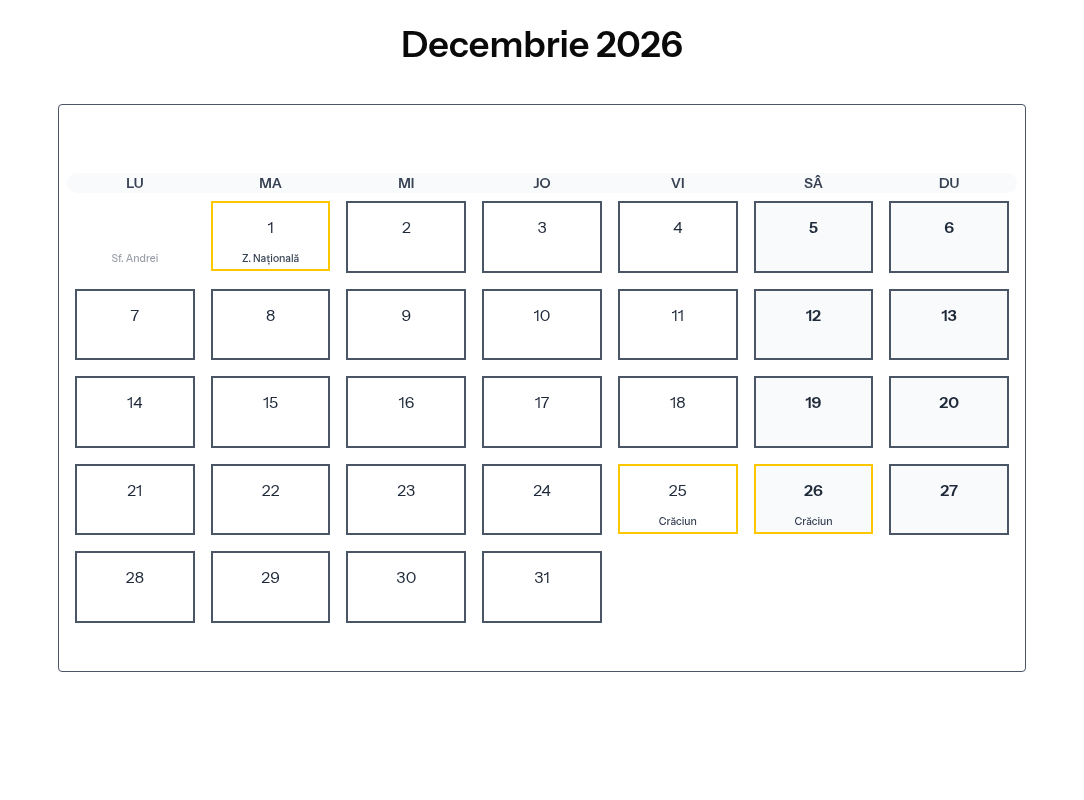 Calendar complet pentru Decembrie 2026 cu toate zilele libere legale și sărbătorile din România.