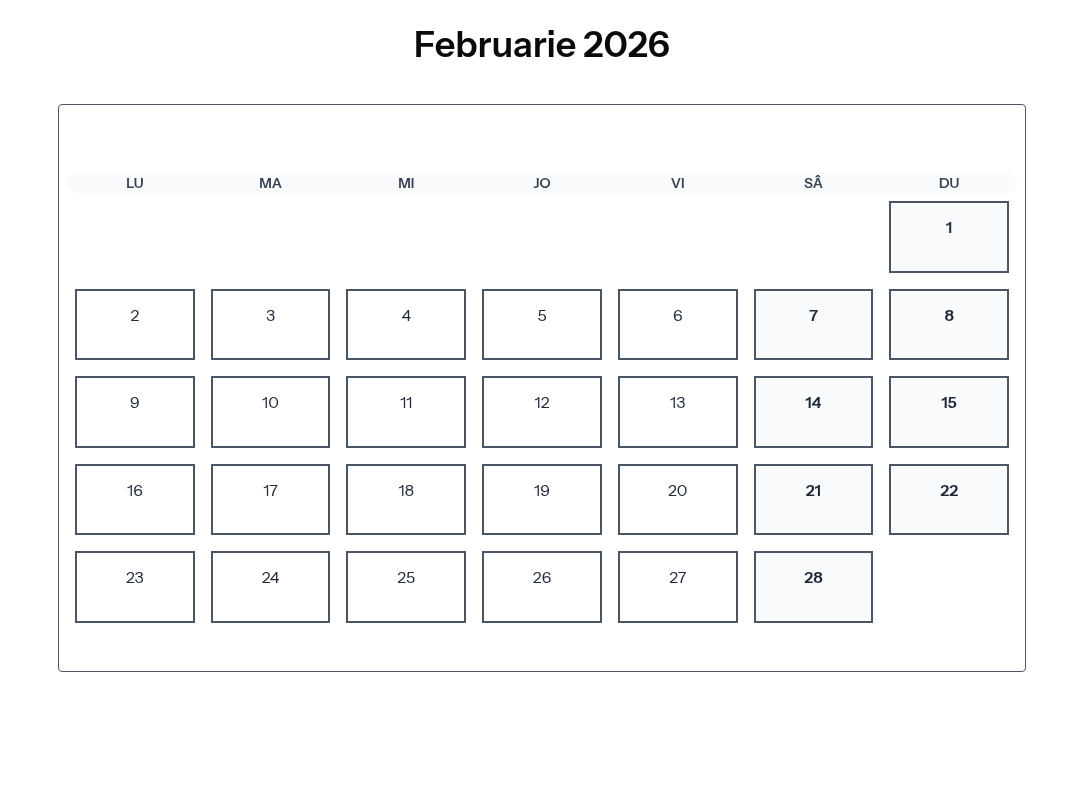 Calendar complet pentru Februarie 2026 cu toate zilele libere legale și sărbătorile din România.