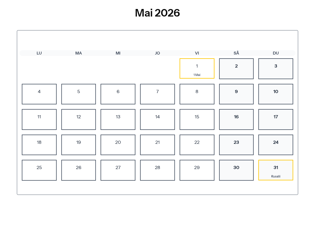 Calendar complet pentru Mai 2026 cu toate zilele libere legale și sărbătorile din România.