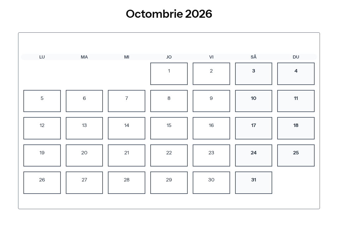 Calendar complet pentru Octombrie 2026 cu toate zilele libere legale și sărbătorile din România.
