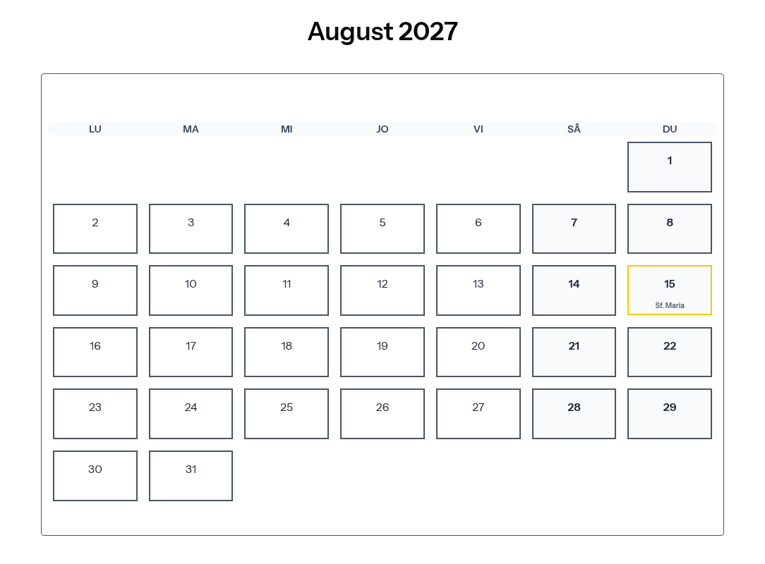 Calendar complet pentru August 2027 cu toate zilele libere legale și sărbătorile din România.