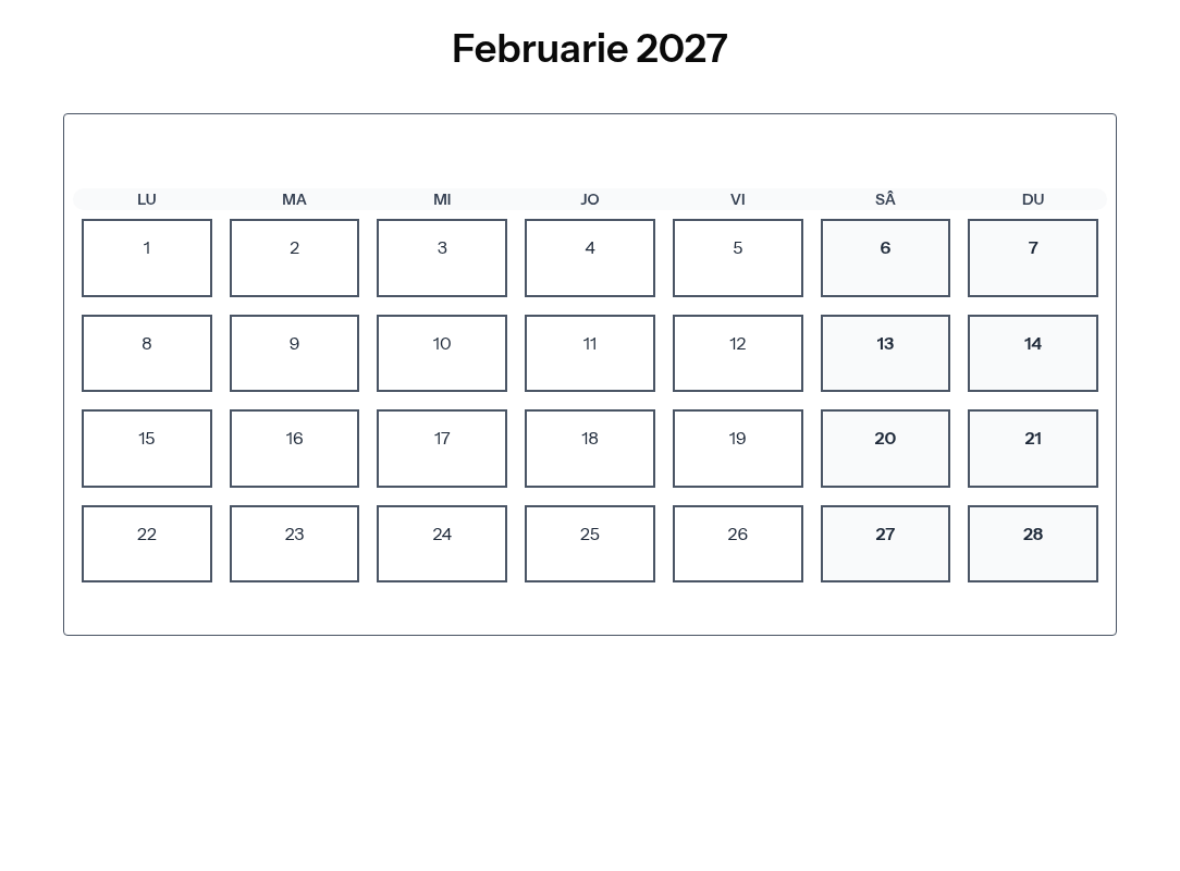 Calendar complet pentru Februarie 2027 cu toate zilele libere legale și sărbătorile din România.