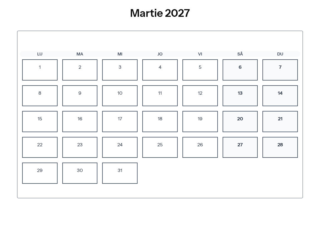 Calendar complet pentru Martie 2027 cu toate zilele libere legale și sărbătorile din România.