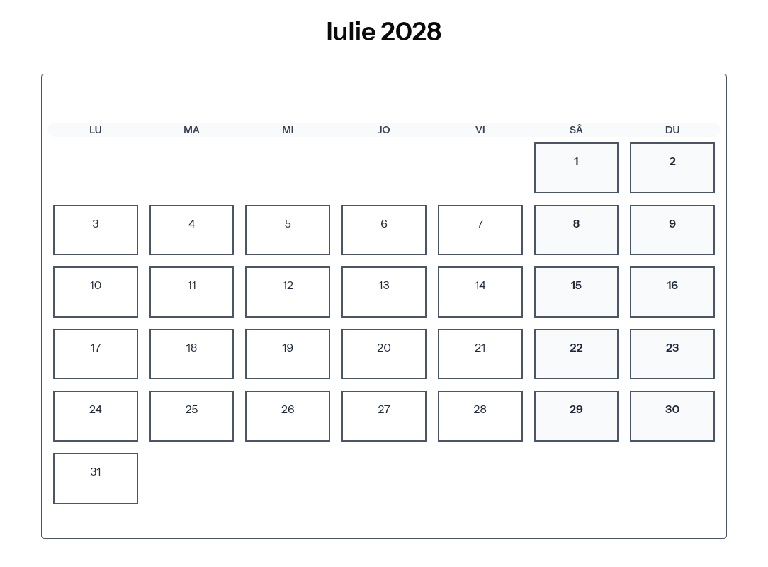 Calendar complet pentru Iulie 2028 cu toate zilele libere legale și sărbătorile din România.