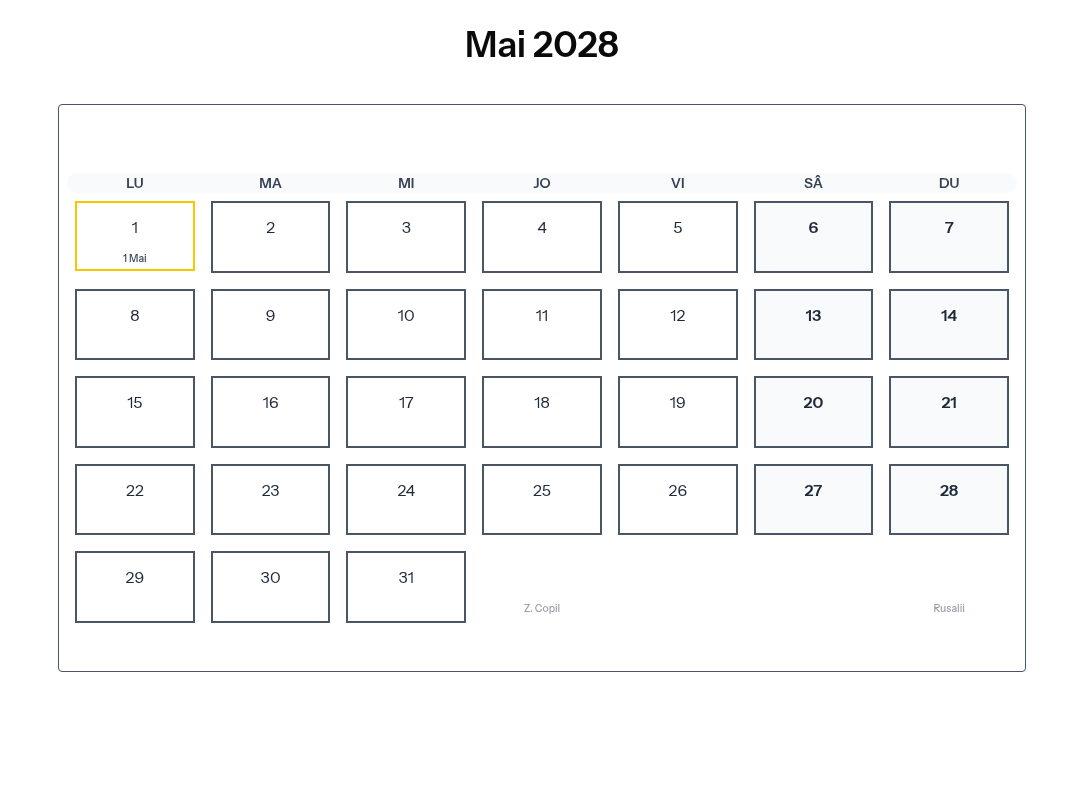 Calendar complet pentru Mai 2028 cu toate zilele libere legale și sărbătorile din România.