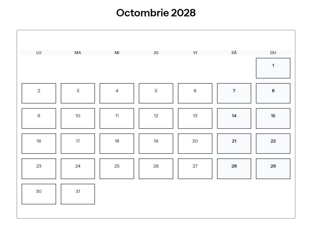Calendar complet pentru Octombrie 2028 cu toate zilele libere legale și sărbătorile din România.