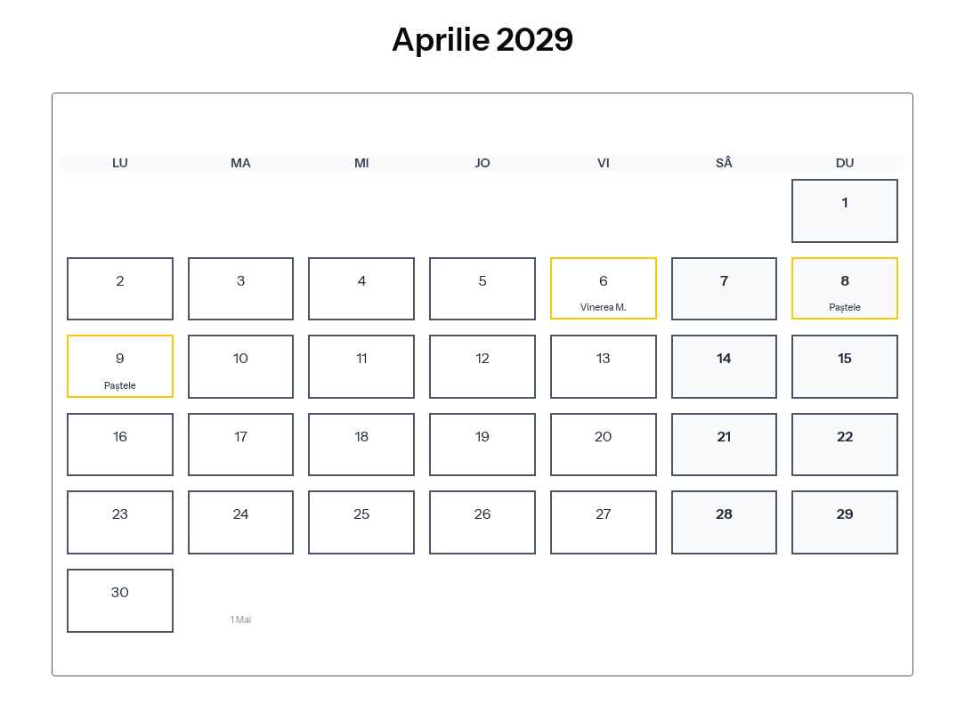 Calendar complet pentru Aprilie 2029 cu toate zilele libere legale și sărbătorile din România.