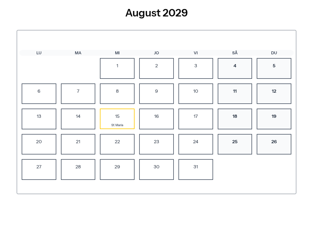 Calendar complet pentru August 2029 cu toate zilele libere legale și sărbătorile din România.