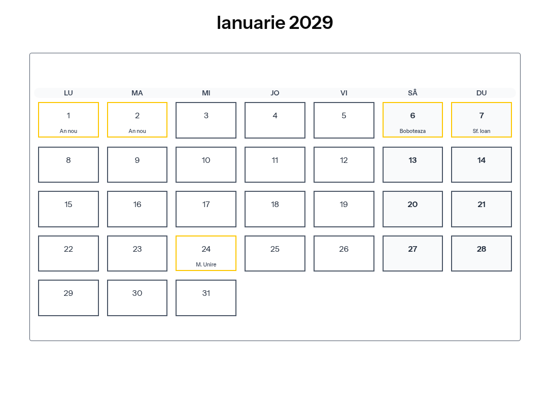 Calendar complet pentru Ianuarie 2029 cu toate zilele libere legale și sărbătorile din România.