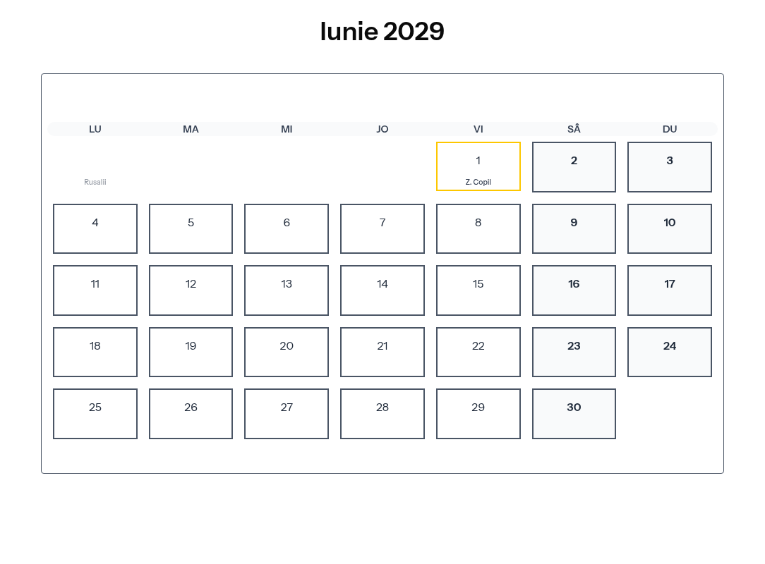 Calendar complet pentru Iunie 2029 cu toate zilele libere legale și sărbătorile din România.