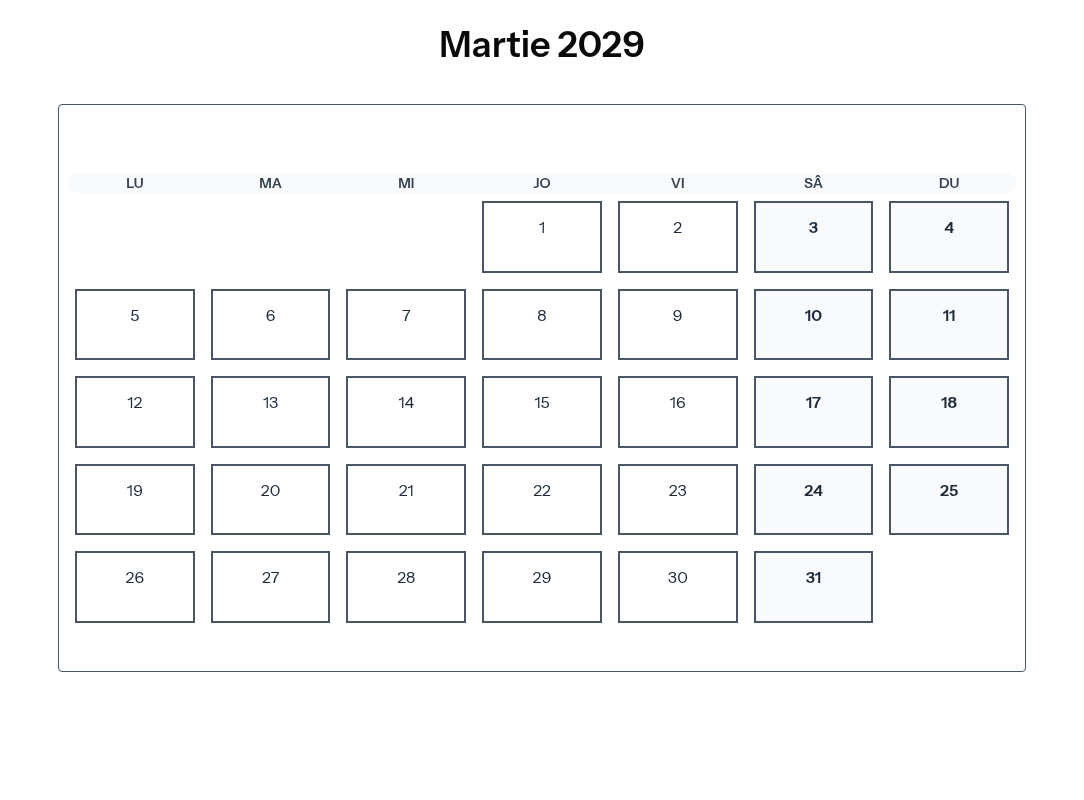 Calendar complet pentru Martie 2029 cu toate zilele libere legale și sărbătorile din România.