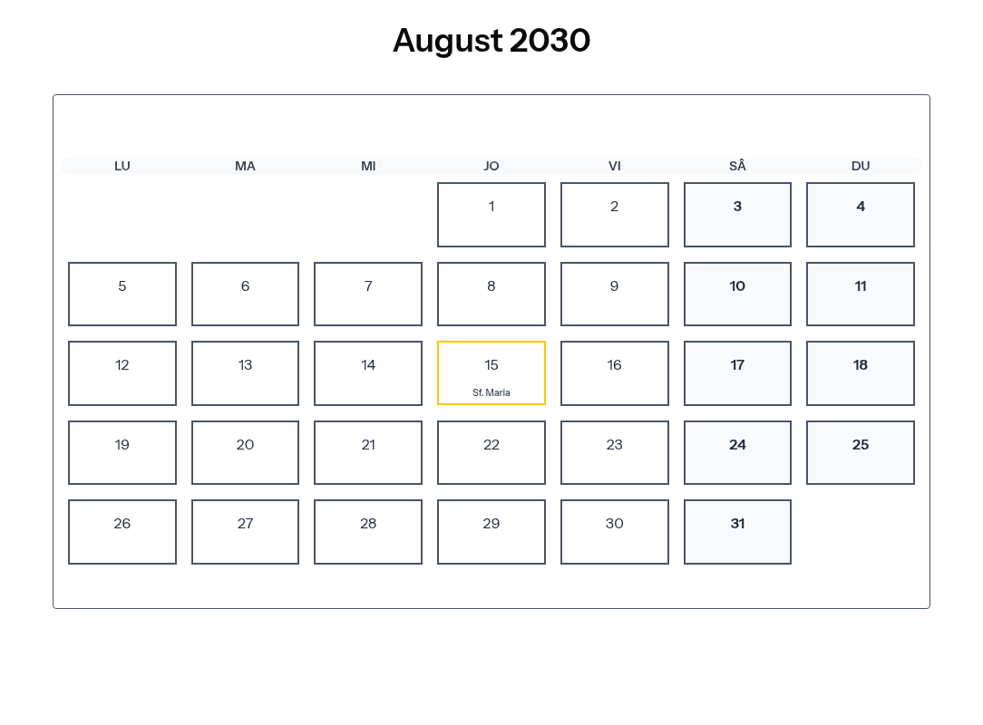 Calendar complet pentru August 2030 cu toate zilele libere legale și sărbătorile din România.