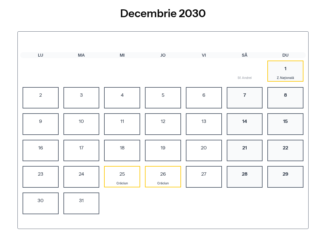 Calendar complet pentru Decembrie 2030 cu toate zilele libere legale și sărbătorile din România.