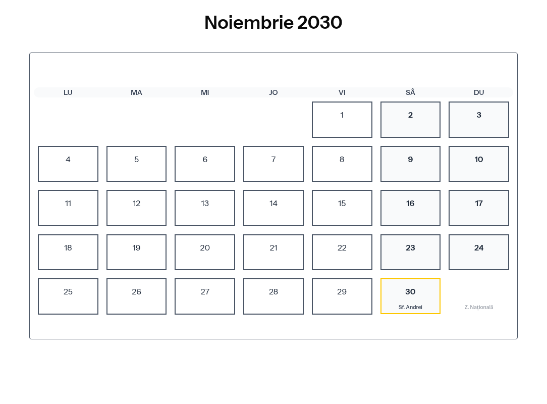 Calendar complet pentru Noiembrie 2030 cu toate zilele libere legale și sărbătorile din România.
