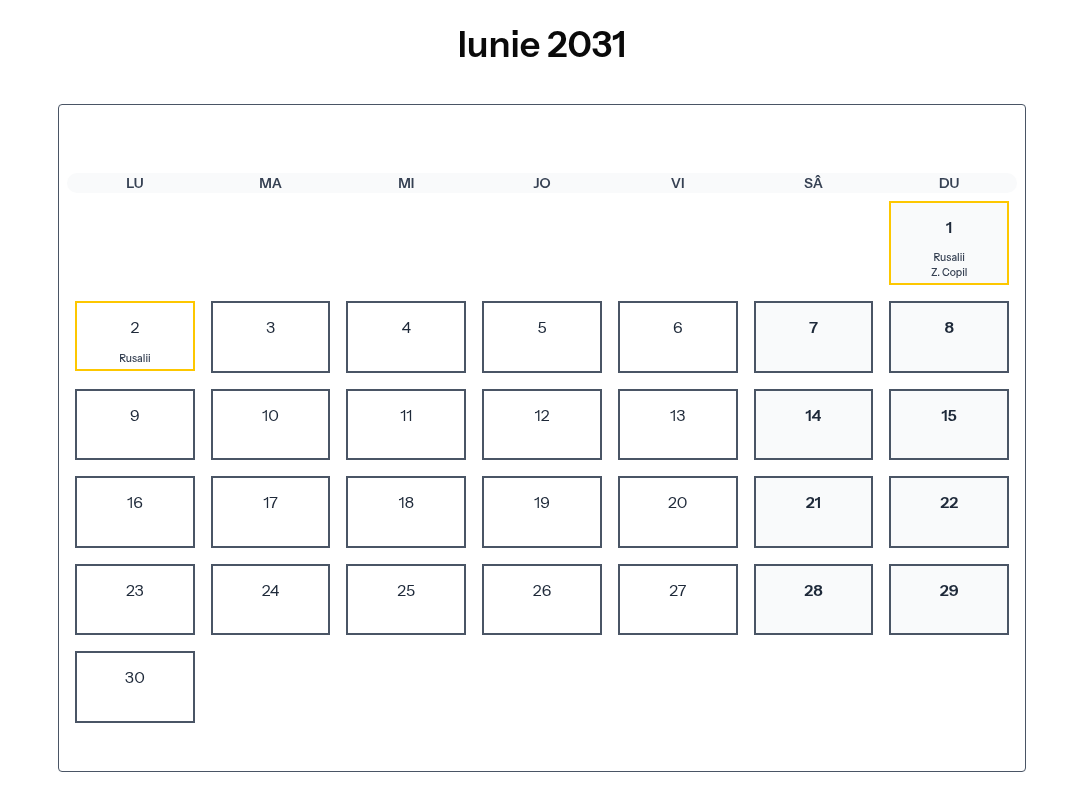 Calendar complet pentru Iunie 2031 cu toate zilele libere legale și sărbătorile din România.