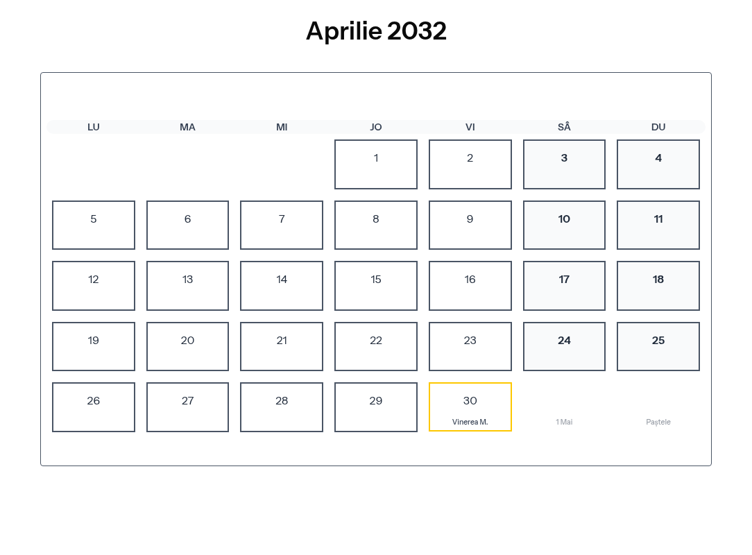 Calendar complet pentru Aprilie 2032 cu toate zilele libere legale și sărbătorile din România.