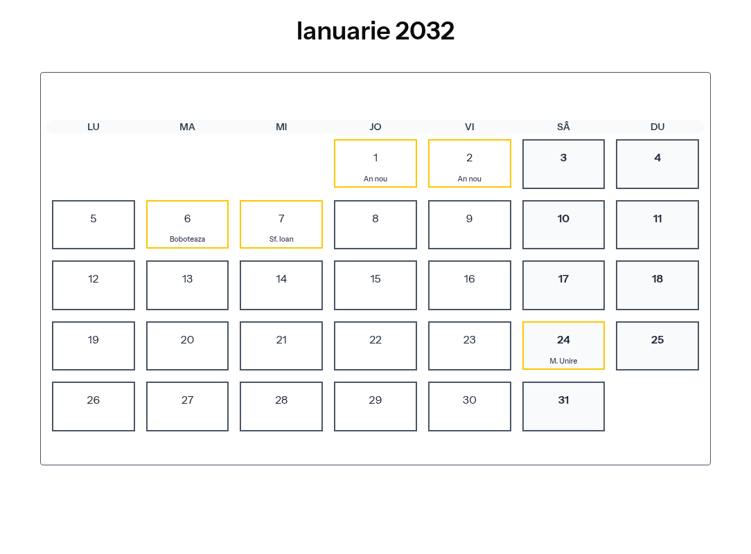 Calendar complet pentru Ianuarie 2032 cu toate zilele libere legale și sărbătorile din România.