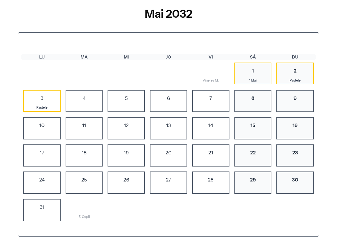 Calendar complet pentru Mai 2032 cu toate zilele libere legale și sărbătorile din România.