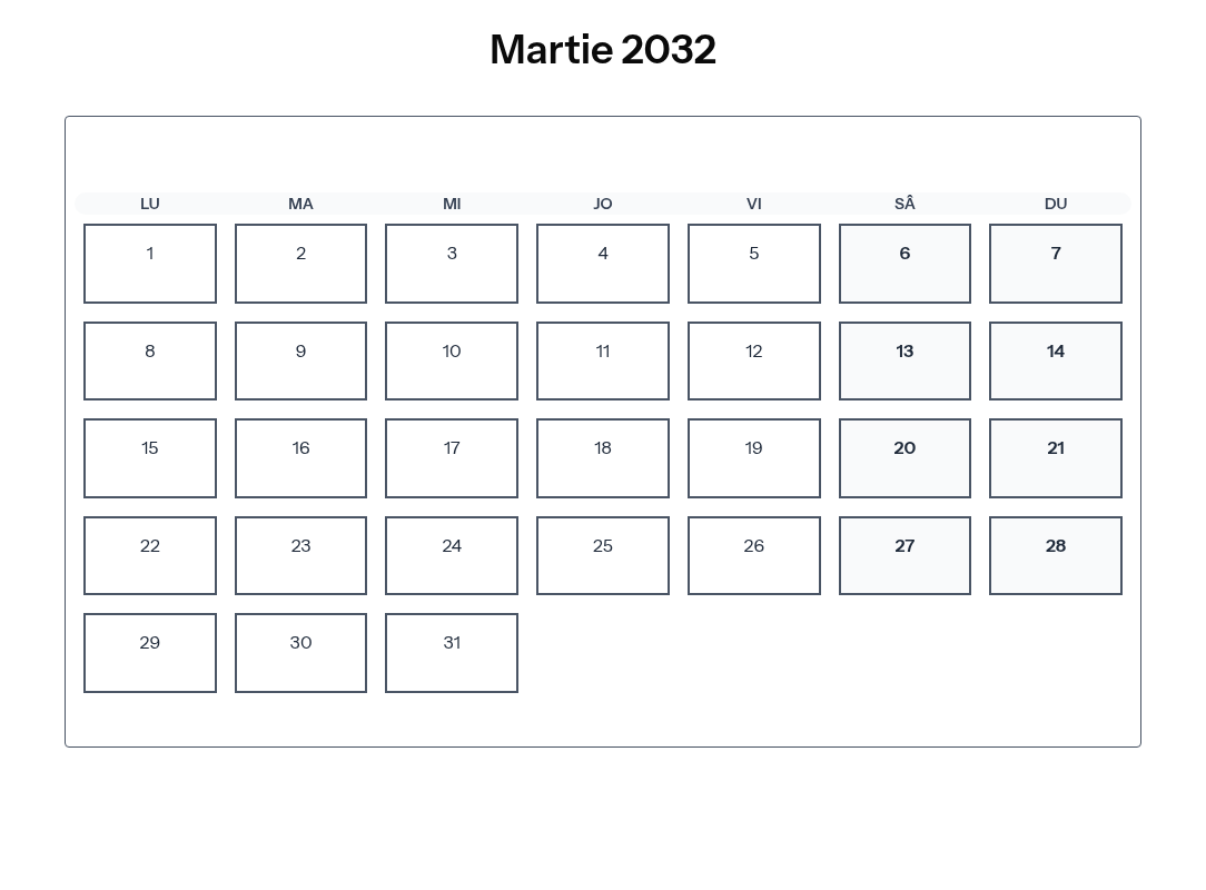 Calendar complet pentru Martie 2032 cu toate zilele libere legale și sărbătorile din România.