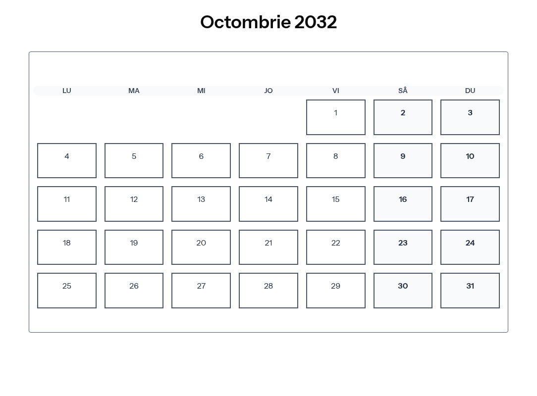 Calendar complet pentru Octombrie 2032 cu toate zilele libere legale și sărbătorile din România.